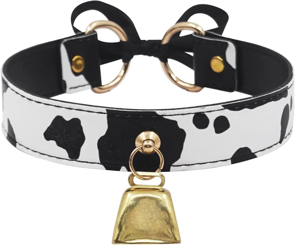 Chic Cow-Print Collar: This stylish accessory for women features a distinctive cow print pattern and high-quality synthetic leather, complete with a silver/gold charm and an adjustable ribbon tie for a custom fit