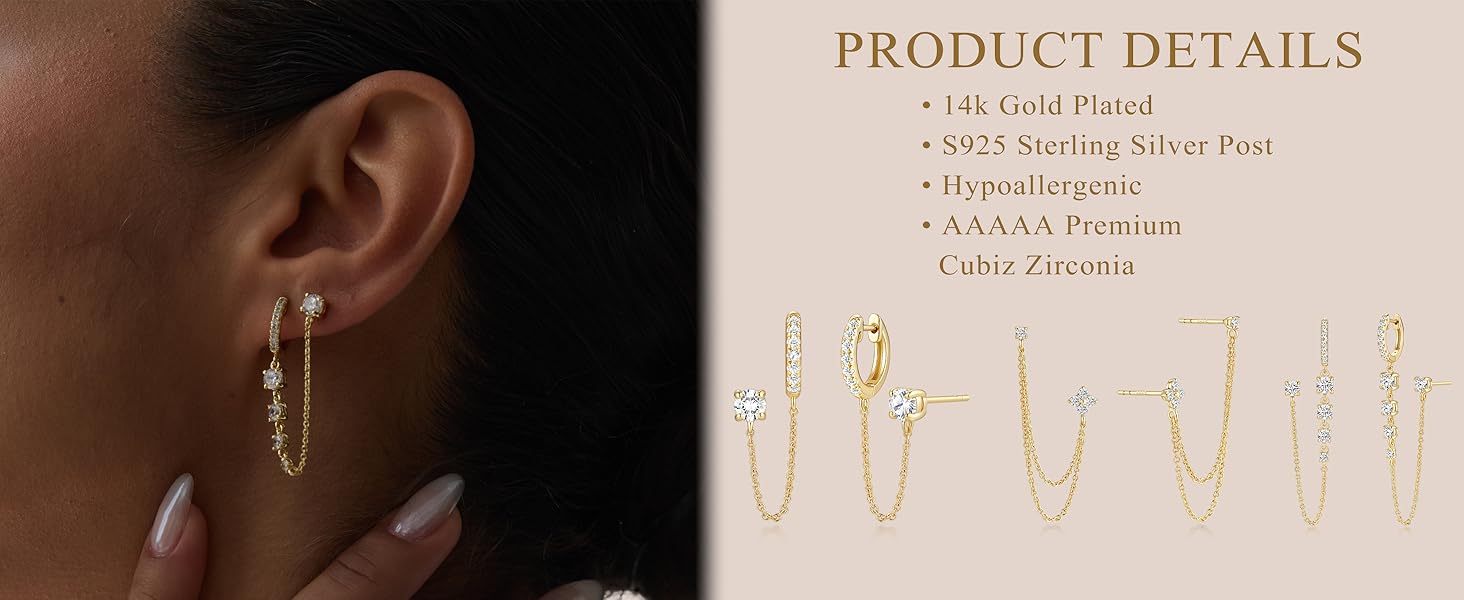 Double Piercing Design: This earring set features a delicate chain connecting a pavé huggie hoop to a solitaire stud for two adjacent ear holes
