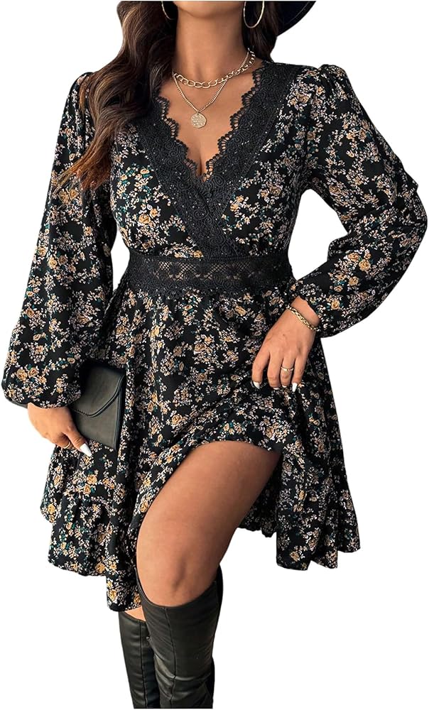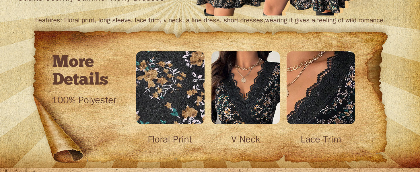 - Features: Floral print, long sleeve, lace trim, v neck, a line dress, short dresses