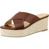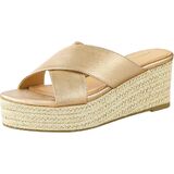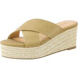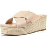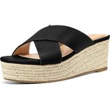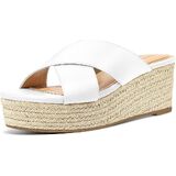 Slip-on open toe platform espadrille wedge sandal with criss-cross upper.