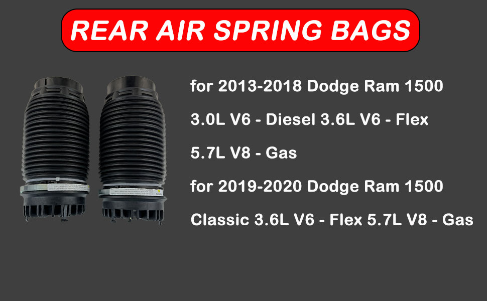 Exact Fitment & Compatibility: Air suspension spring bags CUSTOM FIT FOR RAM 1500 – Specifically engineered compatible with Ram 1500 (2013-2018) and Ram 1500 Classic (2019-2020) models equipped air suspension. Fits 3.0L Diesel, 3.6L V6, and 5.7L V8 engines. Note: Please verify your vehicle's specifications before purchase to ensure a perfect fit.