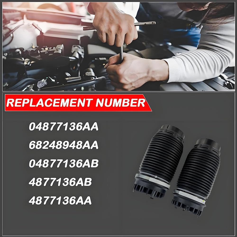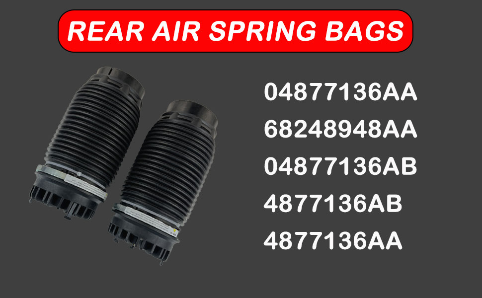 Reference Numbers: Air bag DIRECT REPLACEMENT – Directly replaces original part numbers: 04877136AA , 68248948AA , 04877136AB , 4877136AB ,4877136AA, and more. This air spring kit serves as a reliable solution to restore your truck's ride height.