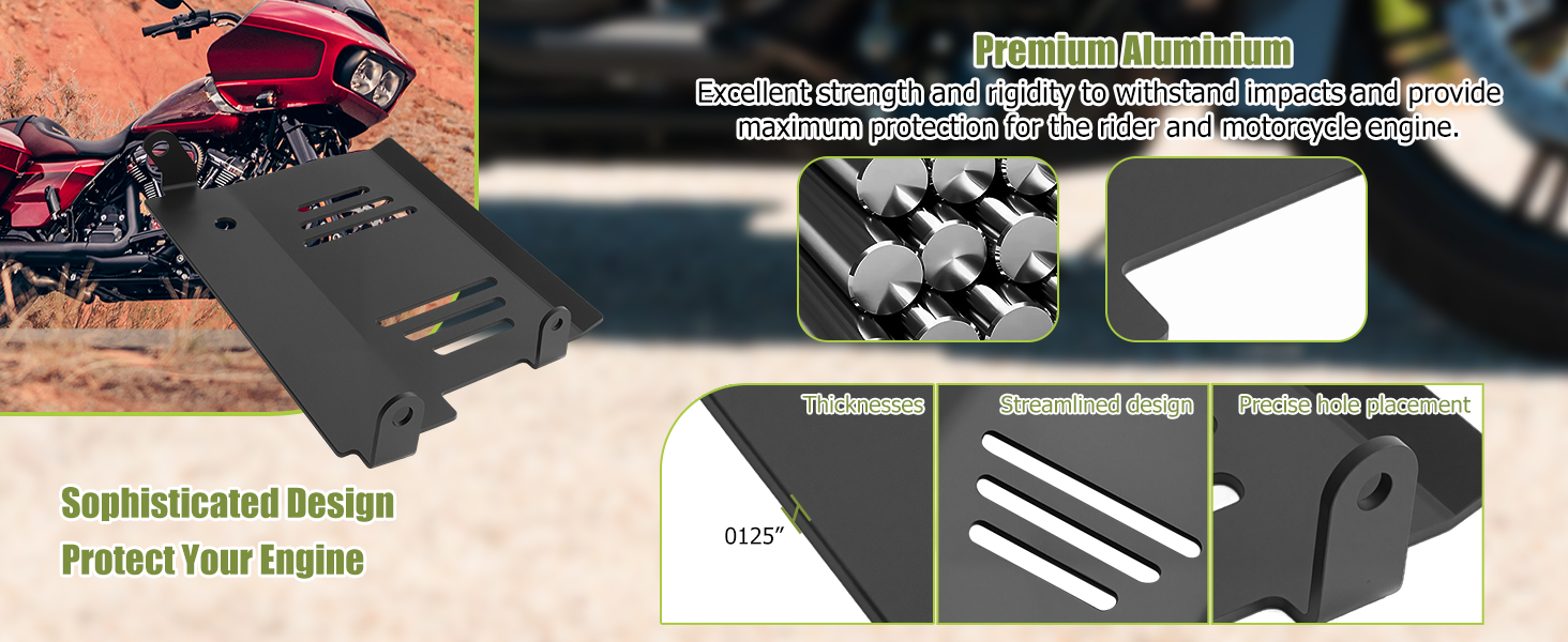Vibration Reduction:Road Glide Skid plate lower engine chassis improves the driving experience by dispersing and absorbing road turbulence and vibration, Riders experience noticeably smoother handling on rough terrain with reduced fatigue during long-distance adventures.