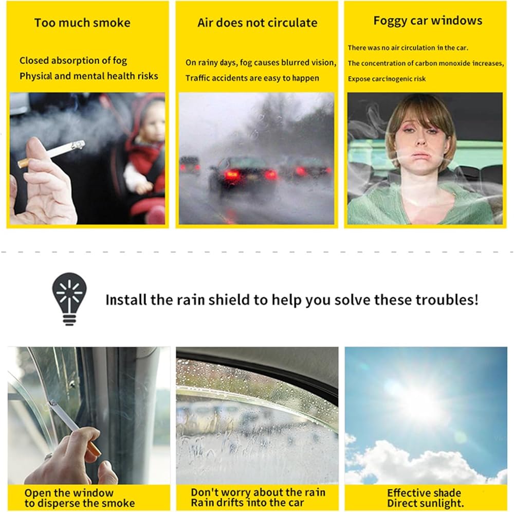 • 【Fresh Air Anytime】: With our rain guards, you can let the fresh air in for many circumstances like rainning day, snowing day, hot summer, highway or smoking in your car without the effect of the situation. It also reduce stuffiness and noise, providing a more comfortable driving experience.