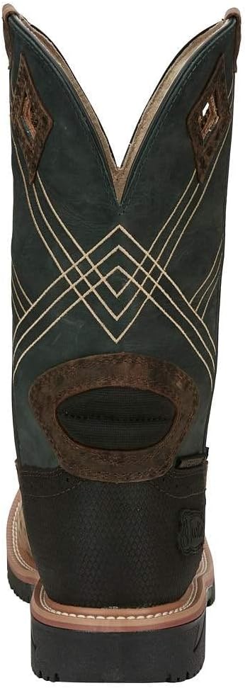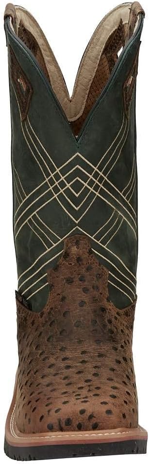 Justin Mens Dalhart Ostrich Print Nano Comp Toe Boots Commanding design and exotic style team up with excellent protection in the 12" Dalhart Waterproof Square Nano Comp Toe boot in brown with ostrich-print leather. This tough workwear essential from our Stampede Hybred series is crafted with a waterproof construction and waterproof smooth and ostrich-print leathers. A nano composite toe and an oil- and slip-resisting outsole let you work confidently in any environment. The Tectuff abrasion-resistant heel counter provides added durability, while the Achilles Relief System(R) reduces foot fatigue and relieves tension. A removable Ortholite(R) insert delivers supportive comfort underfoot, and the bold geometric design gives this boot an edgy look. This boot is Electrical Hazard Rated. Features: Removable Ortholite insert Waterproof Nano composite toe slip-resisting outsole