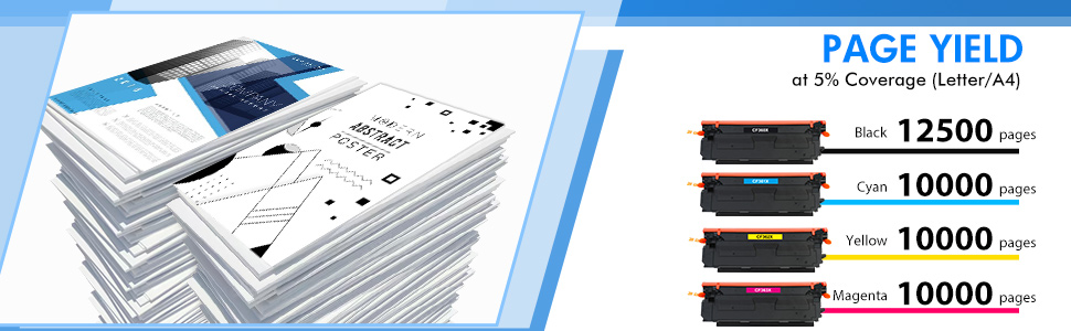 - Page Yield: 12,500 Pages (508X Black) and 9,500 Pages (508X Color) Based on 5% coverage (Letter/A4)