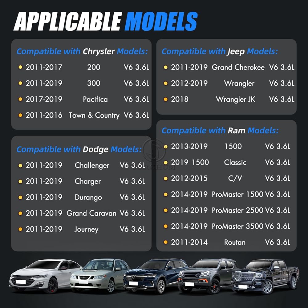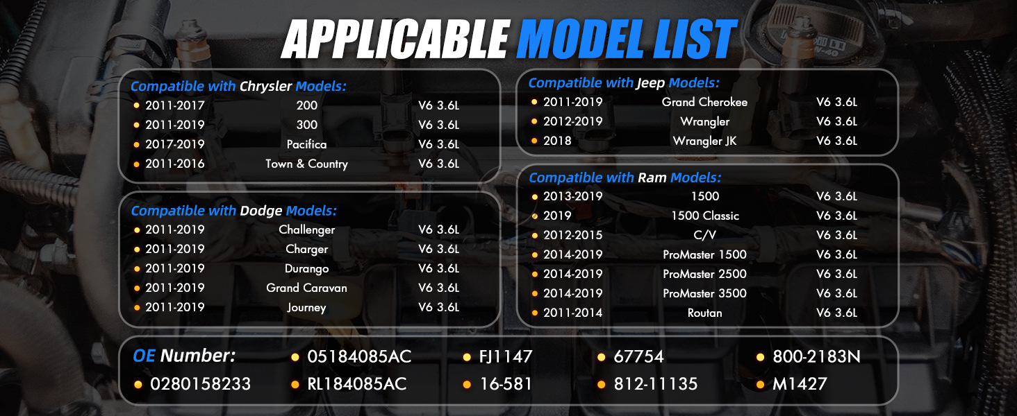 [Fitment] - Engine may affect fitment. Please use "amazon confirmed fit" above to verify specific vehicle fitment details before purchasing - Compatible with 2011-2017 Chrysler 200, 2011-2019 300, 2017-2019 Pacifica, 2011-2016 Town & Country, 2011-2019 Dodge ChallengerChargeDurangoGrand CaravanJourney, 2011-2019 Jeep Grand Cherokee, 2012-2019 Wrangler, 2018 Wrangler JK, 2013-2019 Ram 1500, 2019 1500 Classic, 2012-2015 C/V, 2014-2019 ProMaster 1500/2500/3500, 2011-2014 Routan. *V6 3.6L Compatible with Chrysler Pentastar Engine* |Fuel Injectors Set of 6|