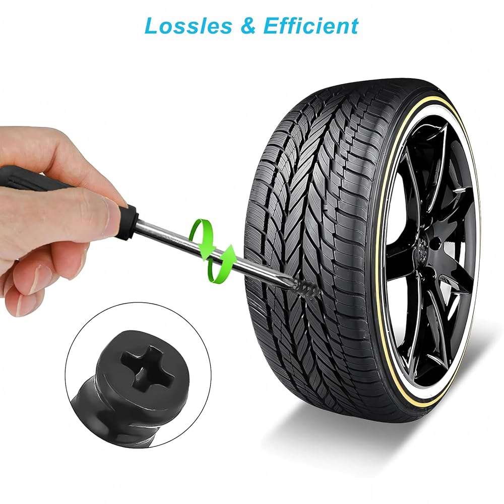 Repair flats anytime with the Tire Repair Rubber Nails Kit—a fast, self-service solution for tubeless tires. The screw in tire repair plugs require no glue or tire removal: simply twist and seal to fix punctures under 6mm. Built with carbon steel and premium rubber, these plugs form a durable, airtight seal that prevents air and water leaks. The tire repair kit with plugs includes two plug sizes, a screwdriver, and a portable box for convenient use on cars, motorcycles, trucks, and bikes. A must-have emergency tool for every vehicle owner.