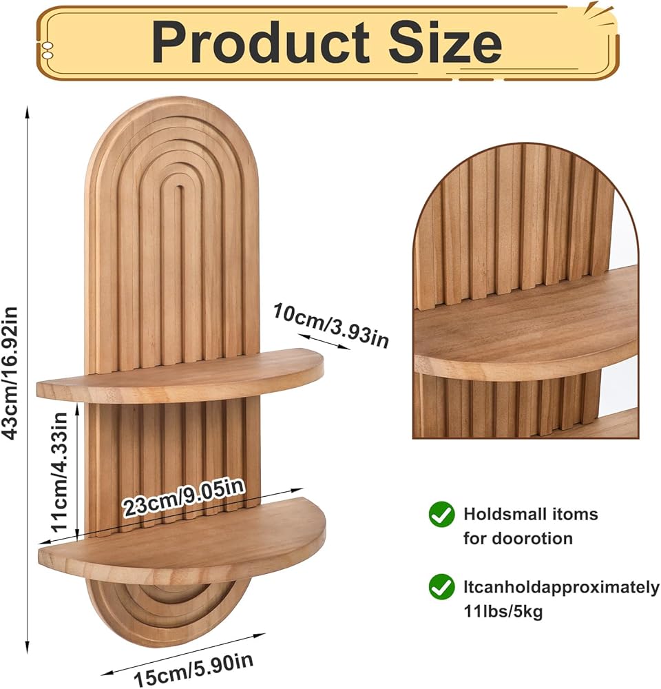 【Size】The wall-mounted floating wooden boho wall shelf stands 16.9 inches tall with two thick shelves measuring 9 inches in width and 4 inches in depth.