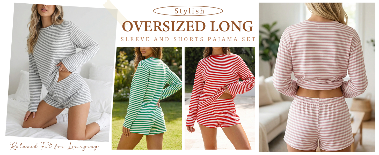 【🌸 Charming Striped Design】This striped Lounge sets for women features an adorable stripe pattern with a relaxed-fit long sleeve top and classic round neckline. Paired with elastic waistband shorts that offer a comfortable, flexible fit. The cute casual design creates an effortlessly stylish look that's both playful and put-together.