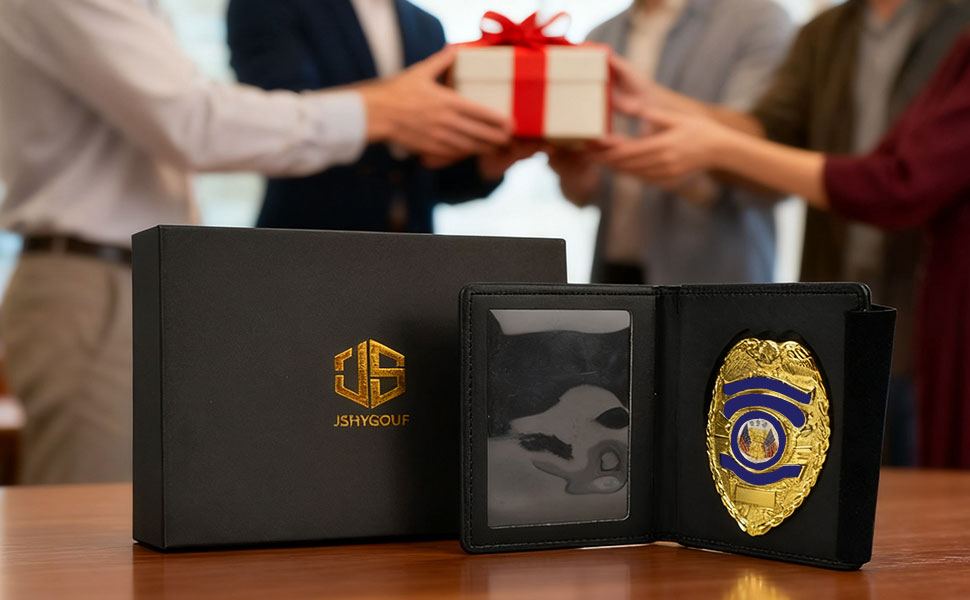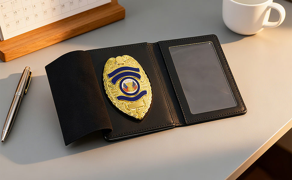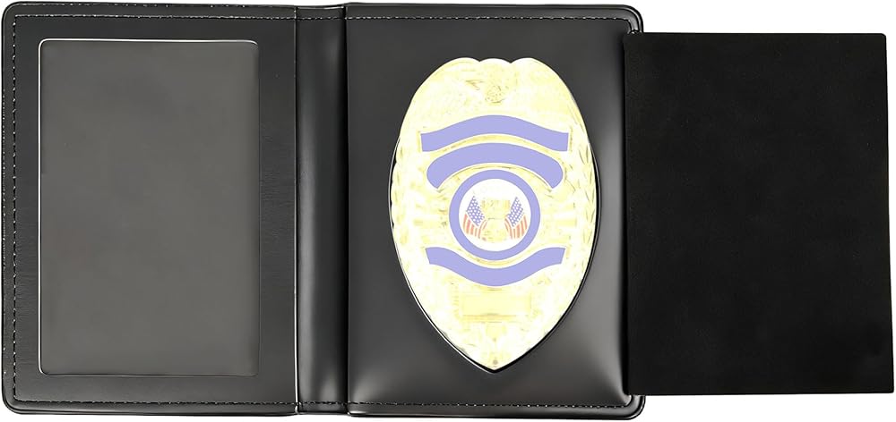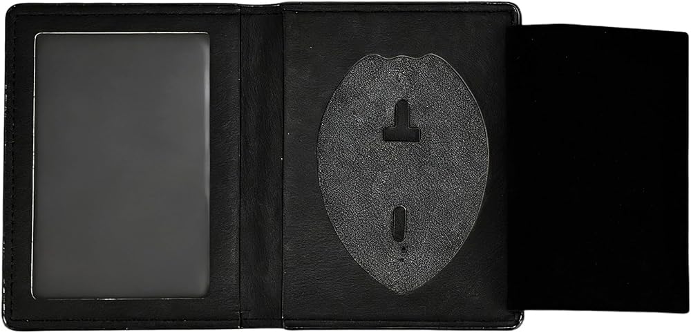 Police Badge Wallet: This badge wallet is best suited for pin-style badges and can also be used for some clip-on badges. It can hold police badges and ID cards, with no credit card slots. Only a clear ID slot and a recessed badge insert with suede protector flap.