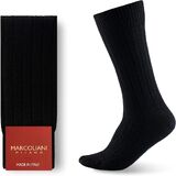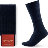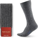 Cashmere — The most noble fiber of all. Obtained by gently combing the Hircus goat of the Central Asian highlands, cashmere is extremely fine and almost weightless. Marcoliani works it with a dedicated knitting technique that enhances its durability without compromising its natural softness. The result is a sock that envelops the foot in light warmth, keeping it dry and offering a uniquely refined comfort. A pleasure to give or to enjoy for oneself.