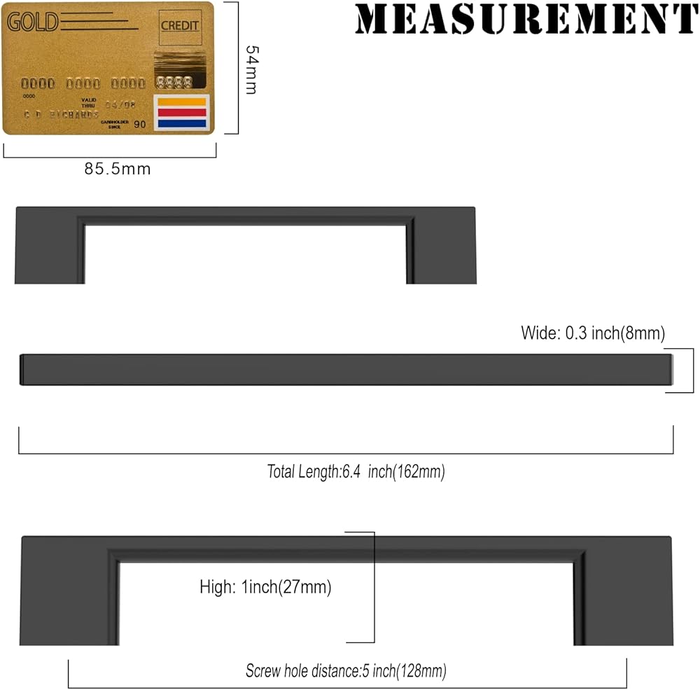 Measurement: Hole Centers(CC):5 inch(128MM); Overall Length:6.4 inch(162MM);Width:0.4 inch(10.5MM);Projection:1.3 inch(33MM); Please check the Size of handles you require carefully before purchasing.
