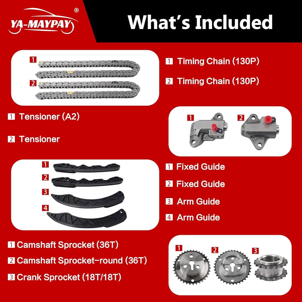 【Accurate transmission】YA-MAYPAY timing chain kit enables precise synchronous transmission between the camshaft and crankshaft through precise chain, gear and tensioner components to provide optimal engine performance and achieve optimal combustion efficiency and power output.