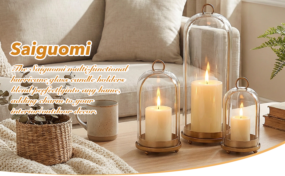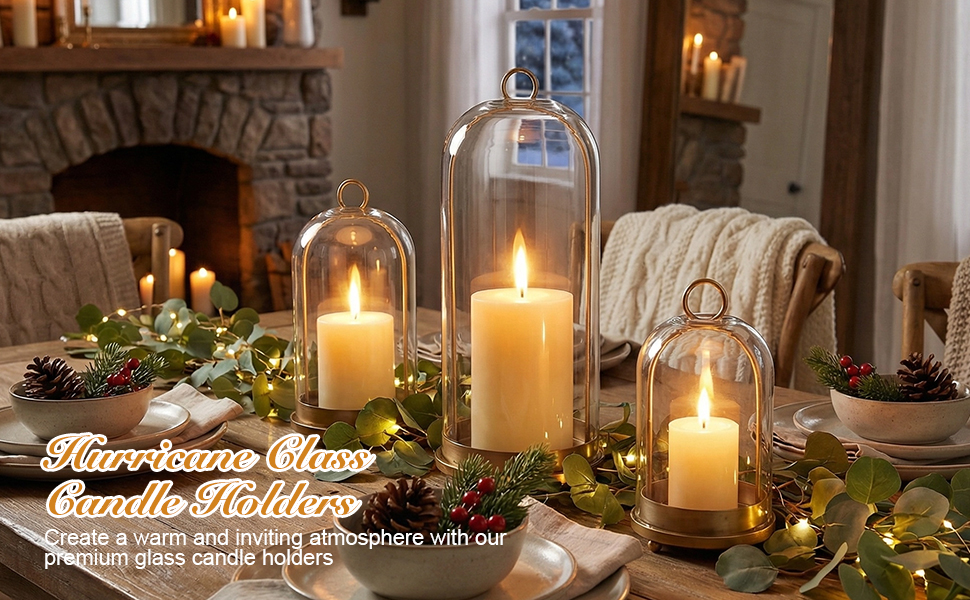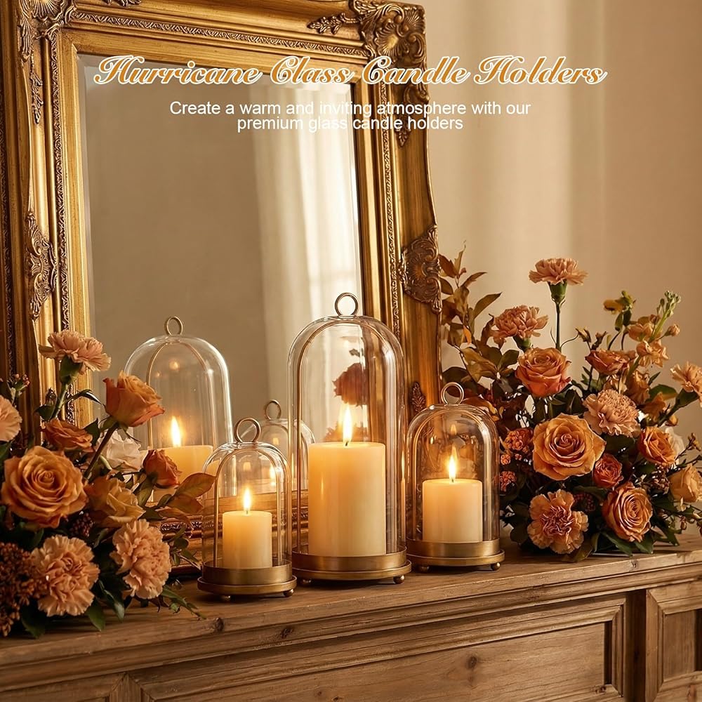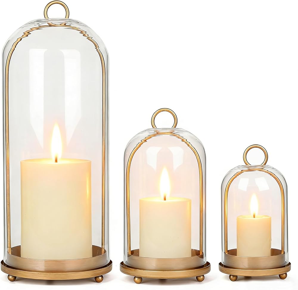 15"&9"&7" Hurricane Glass Candle Holders Set of 3, Metal Candle Holder with Handmade Glass Dome in Brass, Hanging Versatile Hurricane Glass Candle Holders for Pillar Candles (Candles Not Including)