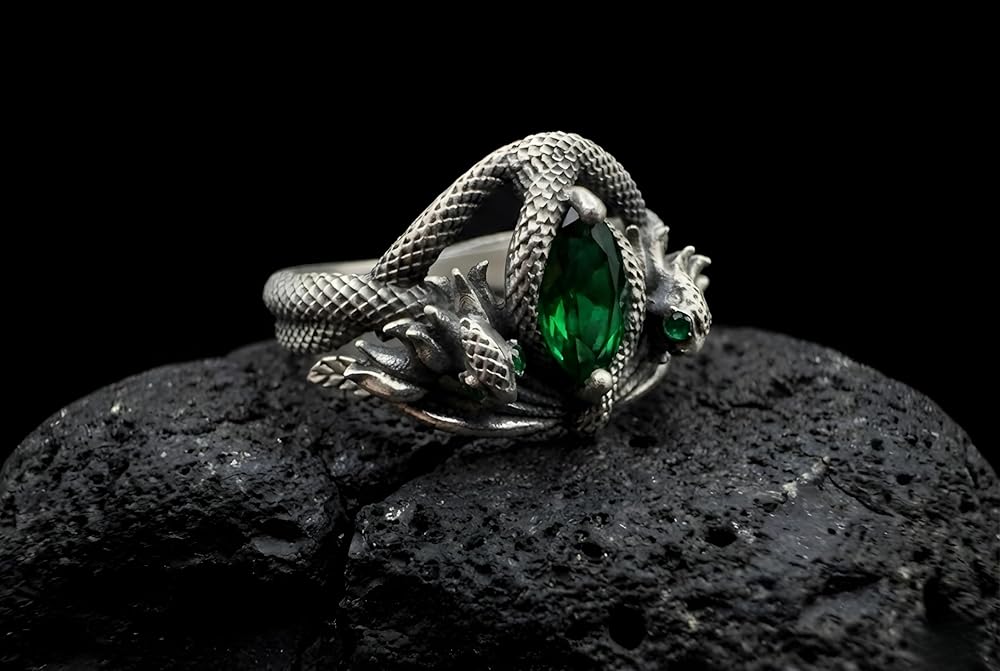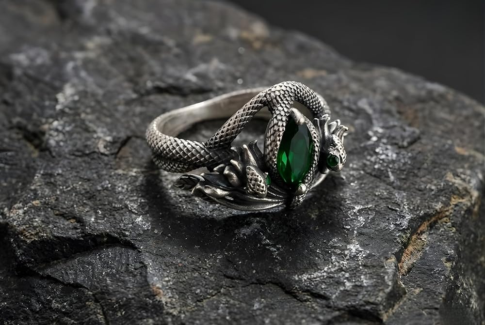 Embrace the spirit of ancient legends and epic fantasy with this masterfully crafted serpent ring. Made from high-grade stainless steel with an antique silver-plated finish, this piece features a brilliant emerald green marquise-cut stone held by two intricately detailed intertwined serpents. Combining medieval aesthetics with modern durability, this ring is designed to add a touch of mystery and noble character to your daily style.