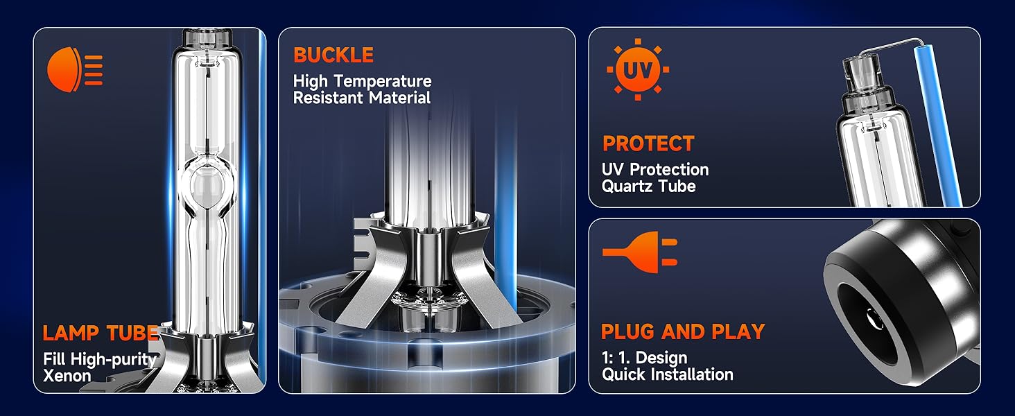 【Service Life of 3500 Hours】SENROBO xenon headlight bulbs are made of 100% quartz UV resistant glass, high-purity xenon gas, high-temperature resistant material, stainless steel metal bracket, and ceramic insulation tube. It is sturdy and durable, with a lifespan of up to 3500 hours, reducing the frequency of replacing xenon bulbs. It is IP68 waterproof and can operate stably in extreme weather conditions such as rainy, foggy, and dust storms
