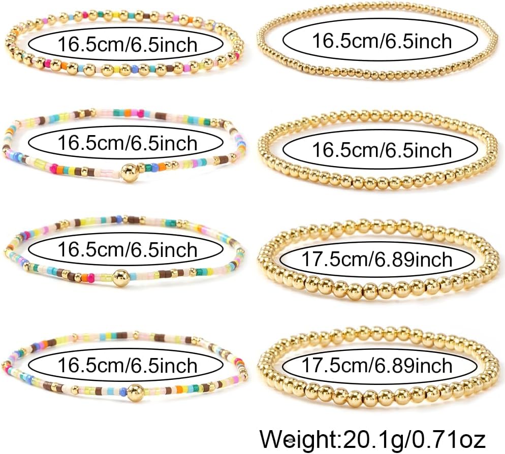 Gold Bracelets: This handmade set features eight bracelets combining gold beads with colorful seed beads in a bohemian style. The stackable bracelets can be worn individually for a subtle accent or layered together to create a fashionable statement.
