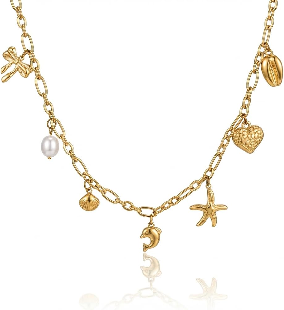 DESIGN ELEMENTS: Features ocean-themed charms including starfish, shell, pearl, and dolphin pendants on an elegant paperclip chain necklace