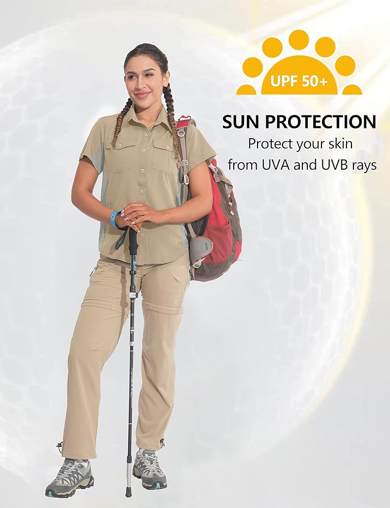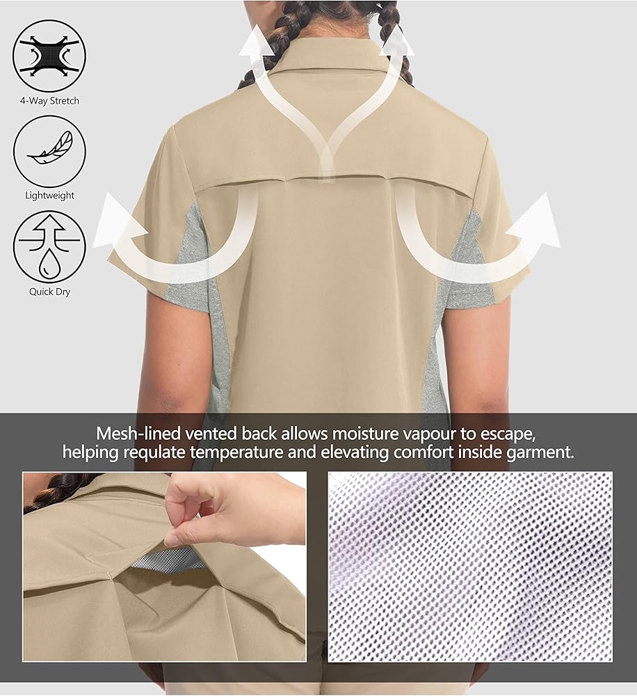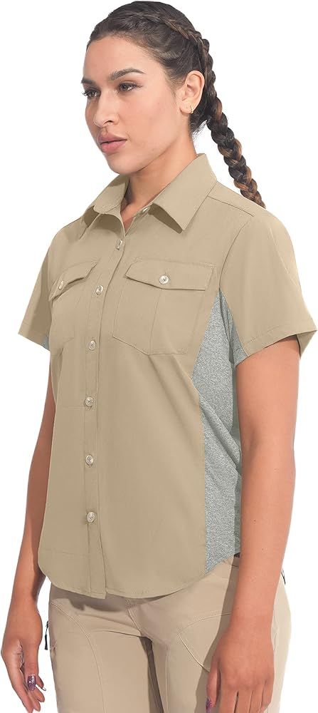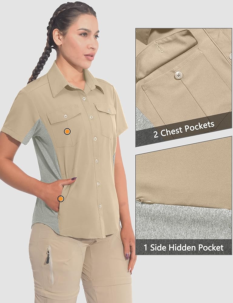 GREAT FOR OUTDOORS: Two front pockets with button; Side zipper pockets. Short sleeve breathable shirt is perfect choice for summer outdoor activities, hiking, camping, travel