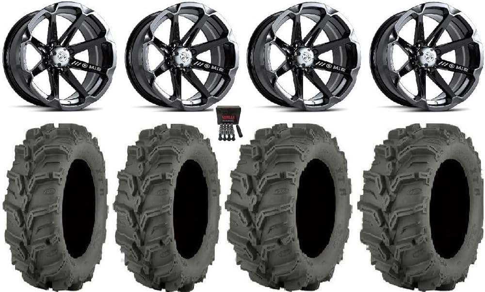 Bundle includes: (4) MSA M12 Diesel ATV Wheel - Gloss Black [14x7] +10mm, 4/156 [M12-04756] + (2) ITP Mud Lite XTR Radial (6ply) ATV Tire [27x9-14] + (2) ITP Mud Lite XTR Radial (6ply) ATV Tire [27x11-14] + (1) KJM Chrome Lug Kit & Valve Stems - 10mm x 1.25" [Beveled] Tire clearance varies by specific machine. Most machines can go at least 1" larger on the tire diameter.