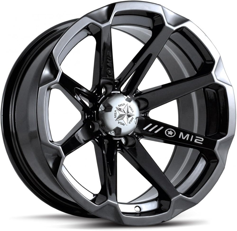 • Bundle of: (4) MSA M12 Diesel ATV Wheel - Gloss Black [14x7] +10mm, 4/156 [M12-04756] + (2) ITP Mud Lite XTR Radial (6ply) ATV Tire [27x9-14] + (2) ITP Mud Lite XTR Radial (6ply) ATV Tire [27x11-14] + (1) KJM Chrome Lug Kit & Valve Stems - 10mm x 1.25" [Beveled]