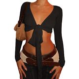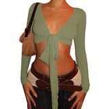Women Fitness Yoga T-Shirts Solid Color Tie-Up Front V-Neck Long Sleeve Bottoming Shirt Seamless Workout Crop Tops Shrugs