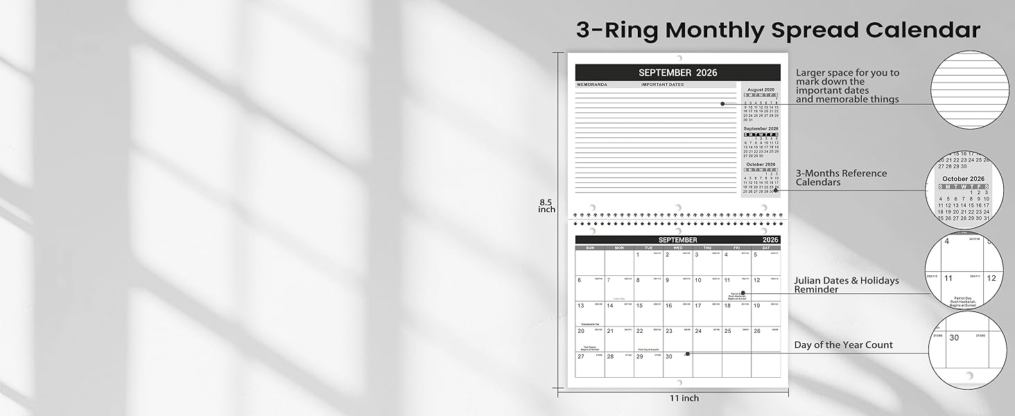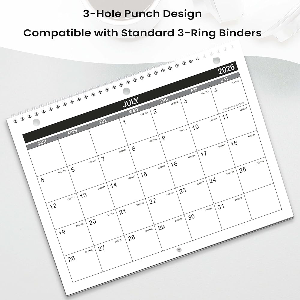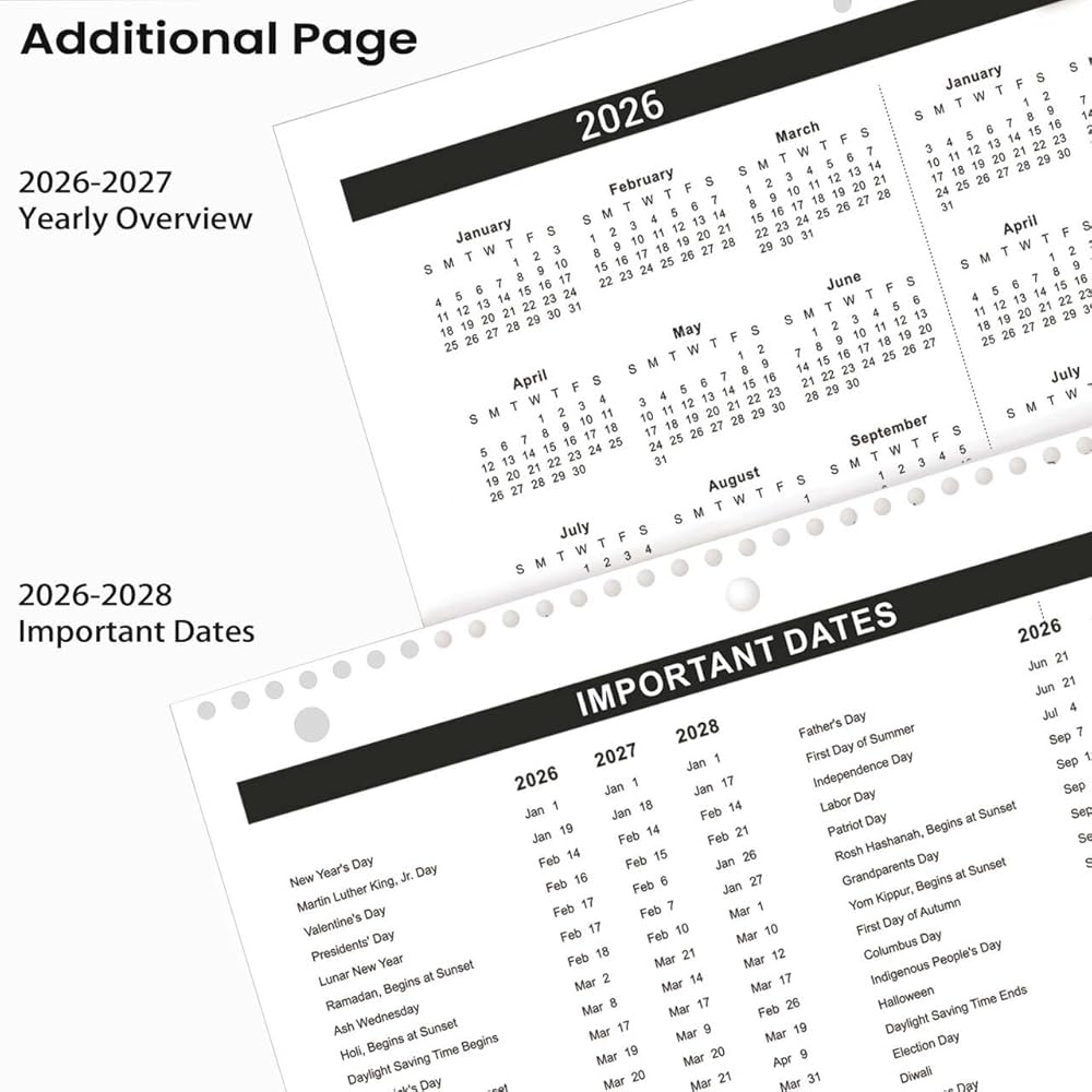Multifunctional Calendar - This calendar 2026-2027 features 3-hole punches for 3-ring notebook and hanging holes for flexible use. Display it on walls, doors, or fridges, or lay it flat on your desk as a functional planner.
