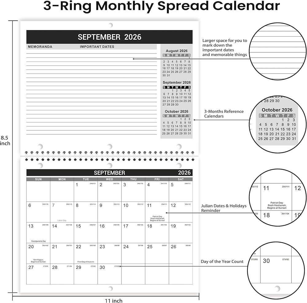 Practical & Classic Calendar - With a classic black-grey design, this wall calendar for 2026–2027 features premium thick paper to prevent ink seepage and feathering, while its sturdy twin-wire binding ensures smooth page-turning. Keep your schedule clear, your focus sharp, and your productivity flowing.