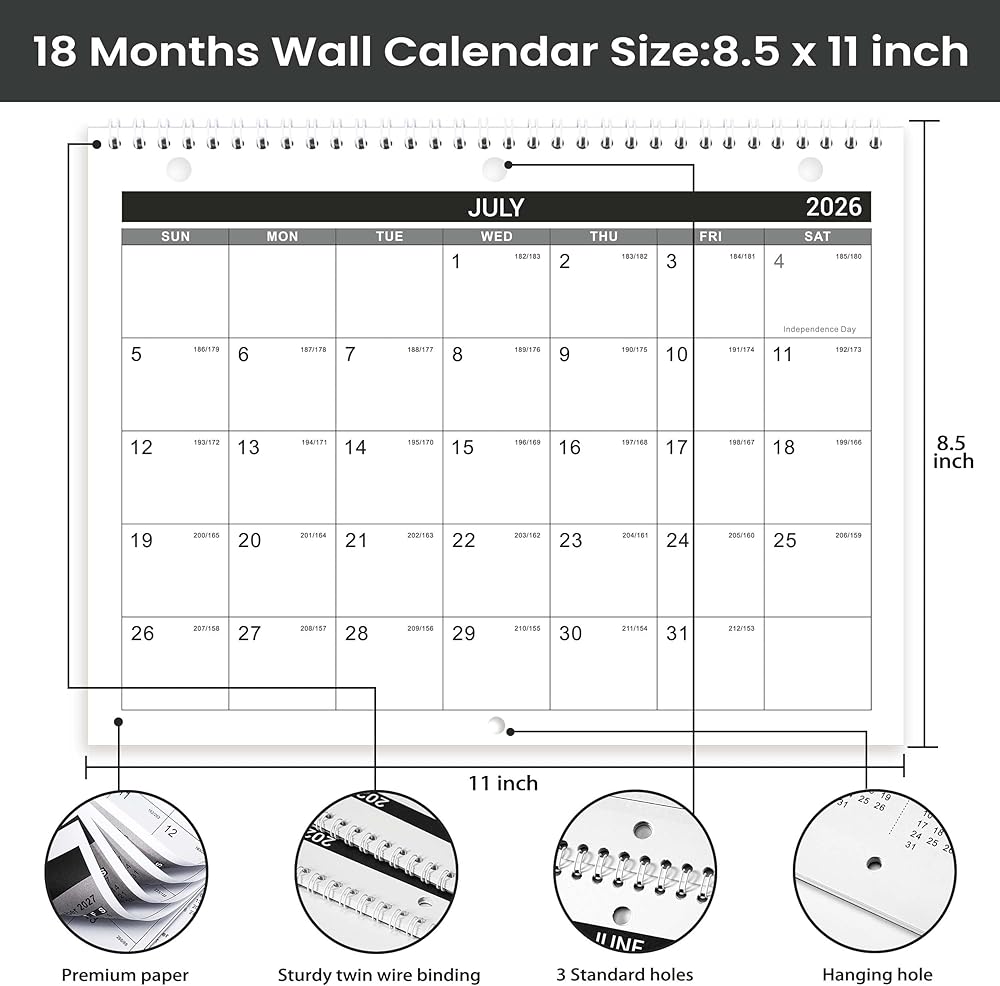 Calendar 2026-2027 - Wall Calendar 2026-2027, 8.5" x 11", 18 Month from Jul. 2026 to Dec. 2027, 3-Hole Punched Binder Calendar with Memo Pages, Twin-Wire Binding, Holidays, For Desk or Wall, Black