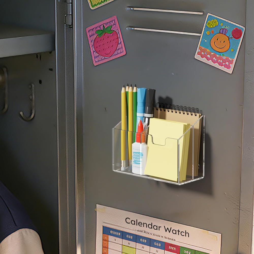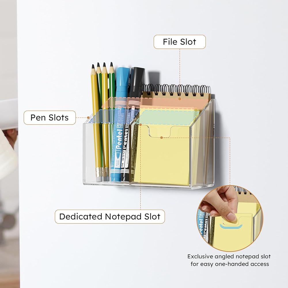 【All-in-One Pen & Marker Organizer】Declutter your space instantly. This versatile magnetic pen holder acts as a compact marker storage hub, perfectly sized to hold dry erase markers, pens, pencils, scissors, and sticky notes. Its crystal-clear design keeps all contents visible for quick retrieval.