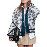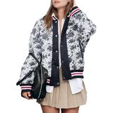 The retro printed baseball jacket with a three-color striped collar design better reflects the style.