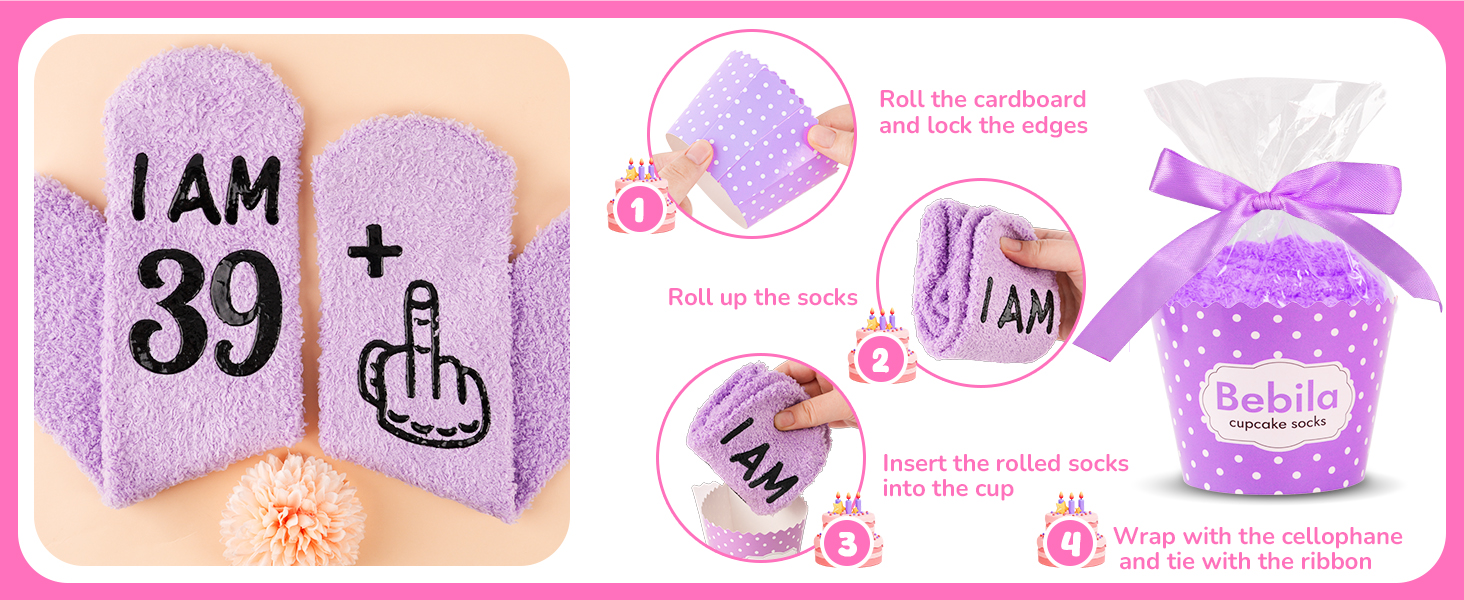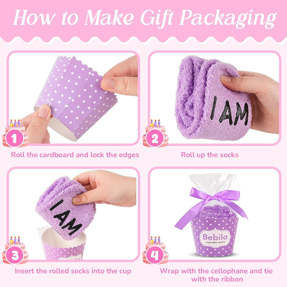 LOVELY CUPCAKE PACKAGING: We provide a birthday gifts box and paper belt with each pair of funny socks. Elevate your gifting experience with our charming cupcake-themed packaging! Just only need follow the easy steps to assemble the cupcake-shaped box, and you'll prepare a nice gift ideas for women 50s