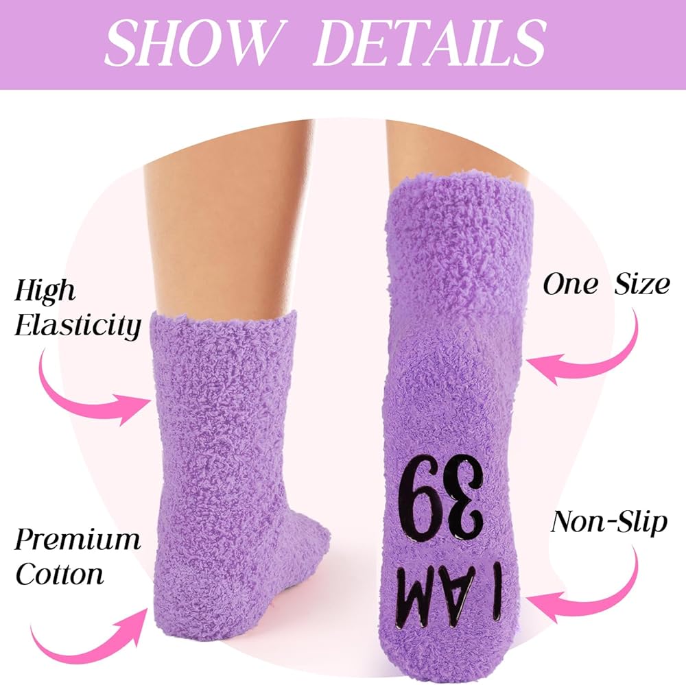 COMFORT MATERIAL: Our funny birthday socks are made of coral velvet. The soft, plush fabric feels gentle against your skin, making these socks a delight to wear, and the non-slip black soles provide excellent traction, ensuring your safety on any surface, whether you're walking on hardwood floors, tiles, or carpets
