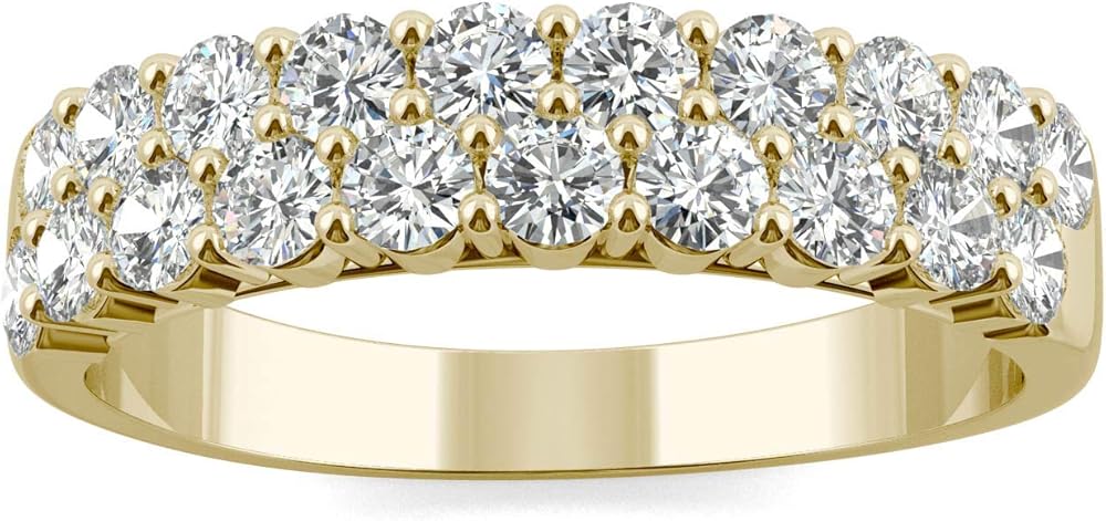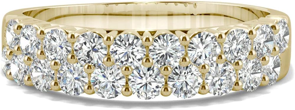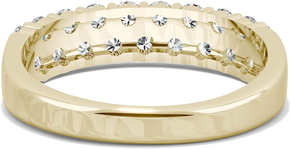 About the jewelry: This charming band showcases 2.4mm round cut Moissanite by Charles & Colvard gemstones. Beautifully crafted in 14K yellow gold and secured in a shared prong setting. Ring size 6.5.