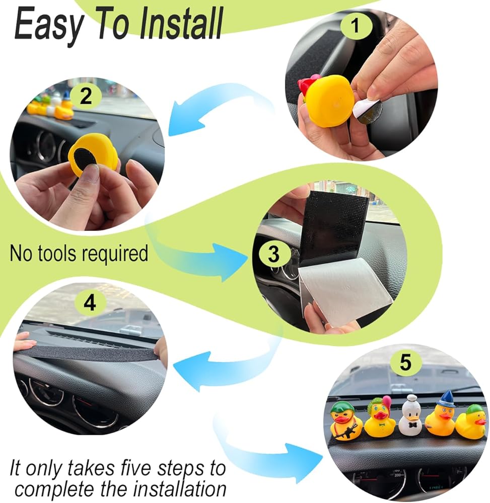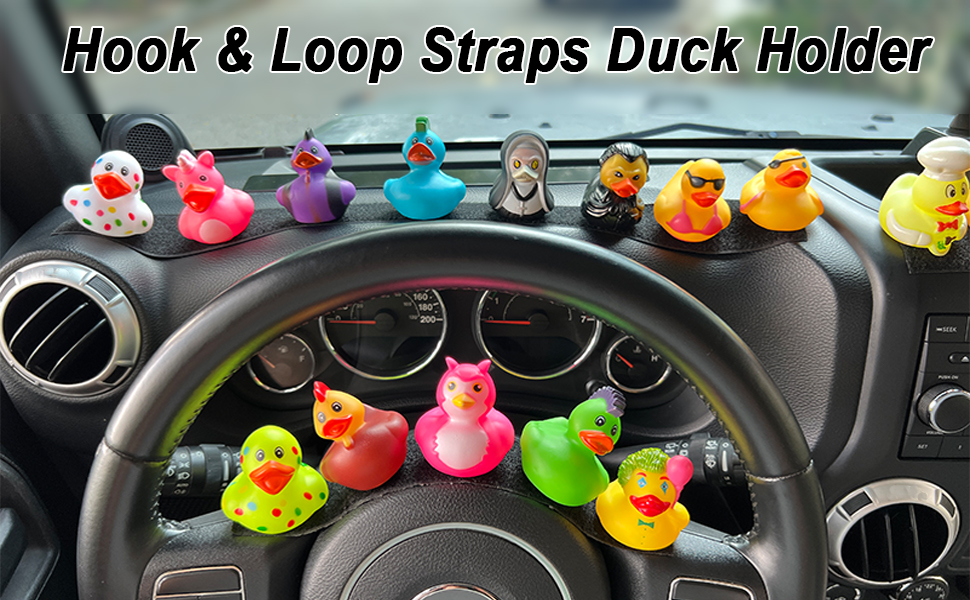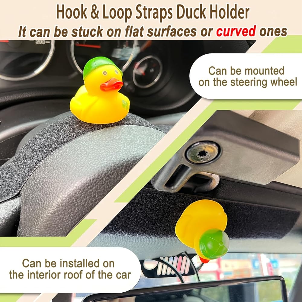 Upgraded Design: This duck mount is upgraded to hook & loop Straps, can be stuck not only on flat surfaces but also on curved ones, and the loop strips can be trimmed according to personal needs. The rubber ducks with the hook pad attached can also be stuck to any other loop surface inside your car, such as seats and the trunk