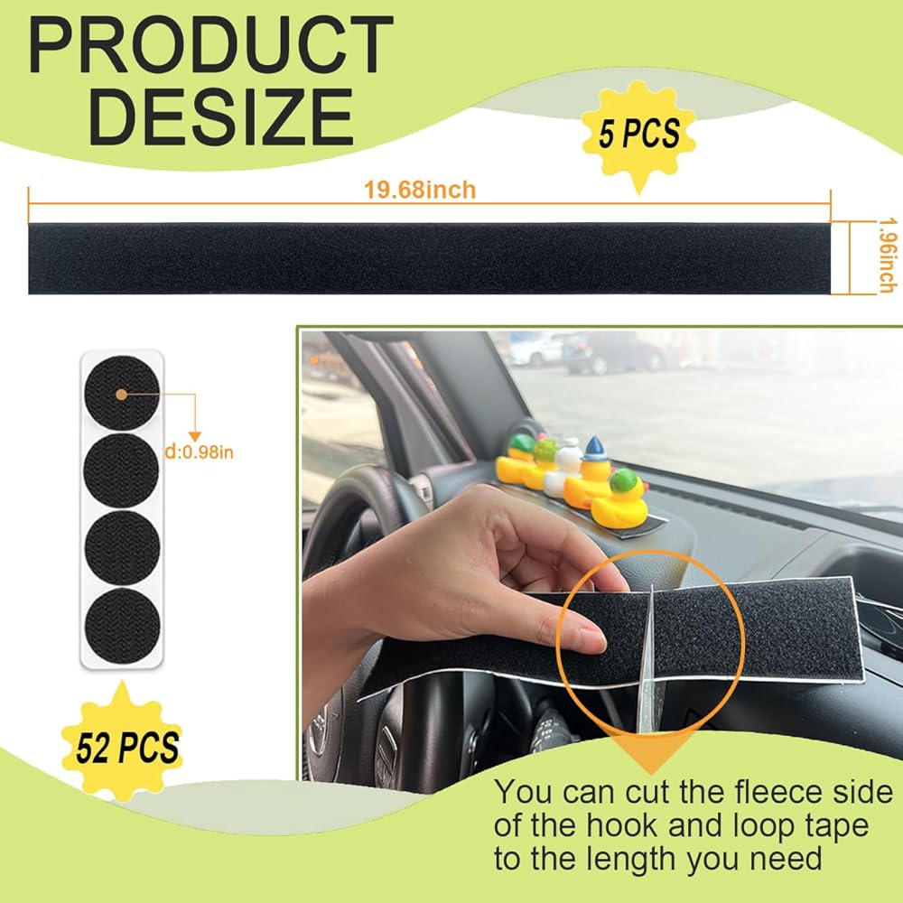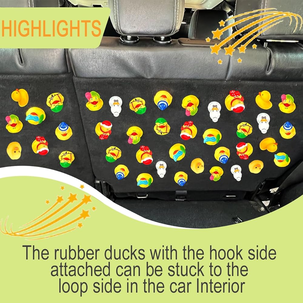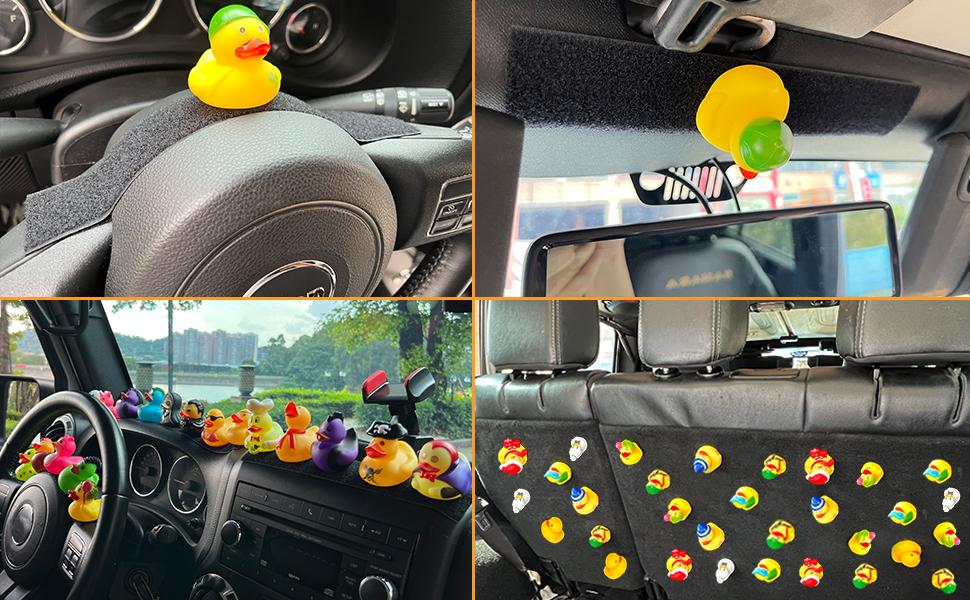 Durable Set: This Rubber Duck Holder for Jeep includes 52 Pcs self-adhesive 1-inch Hook Pads and 5 Pcs self-adhesive 19.7*1.97-inch Loop Strips, solving your troubles with the many disorganized ducks