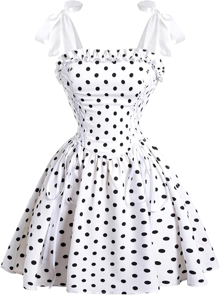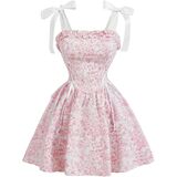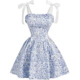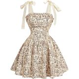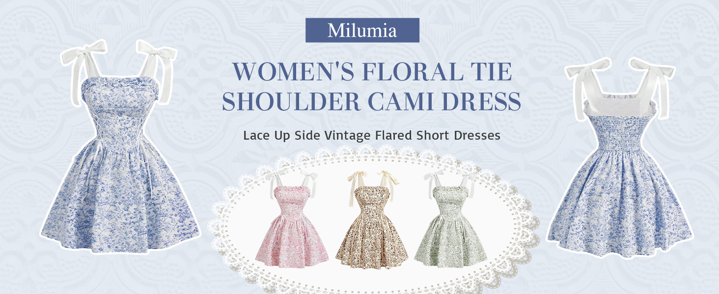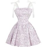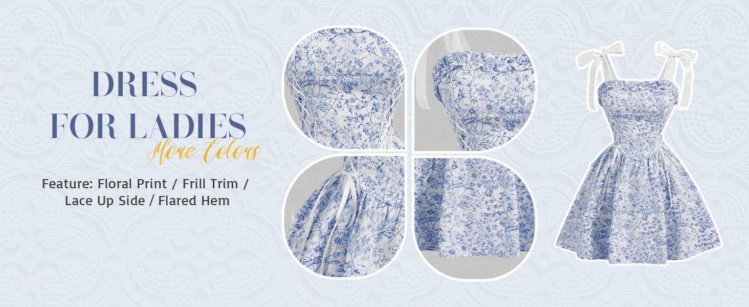 - السمات: طباعة زهور، زخرفة مكشكشة، جانب من الدانتيل، أشرطة ربط، ظهر مكشكش، حاشية واسعة، طول قصير، فستان للسيدات