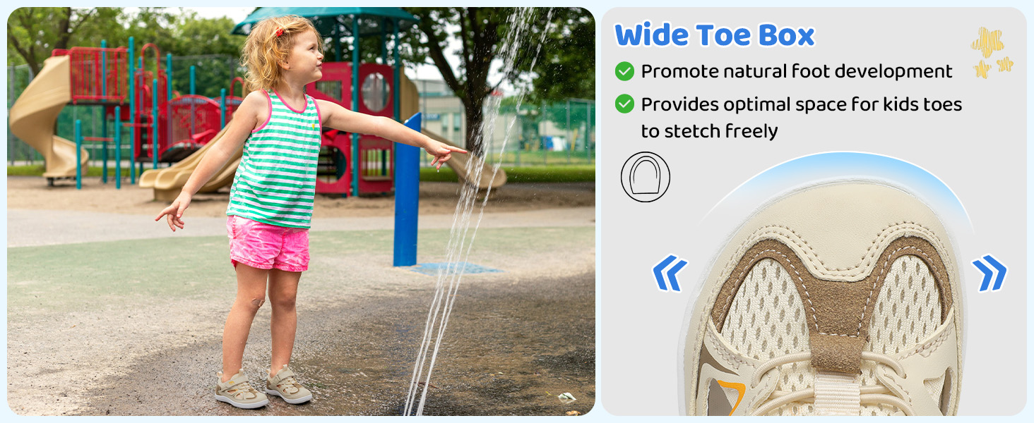 Wide Toe and Natural Barefoot: These kids sandals with wide toe box and low drop design,allow the kid's toes to stretch freely without being squeezed,strengthen foot muscles, and elevate sensory awareness, ensures correct posture and balance,nurturing holistic foot development.Meeting the needs of any foot-type child