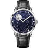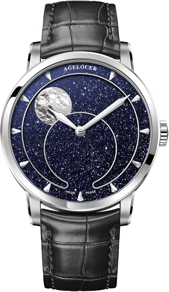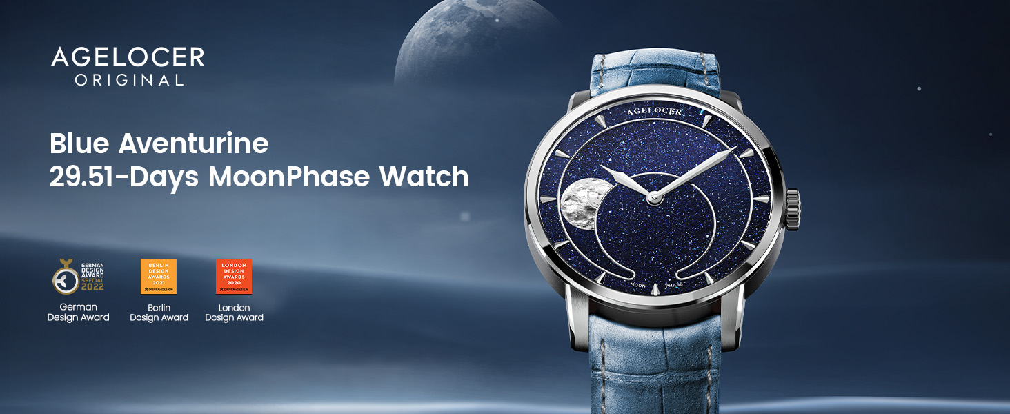This is a precision panoramic large aperture moon phase automatic mechanical watch crafted from blue aventurine, the material that most closely resembles the starry night sky, designed by Swiss chief designer Etienne Ruffieux, inspired by the sun, moon, and stars. The intricately carved luminous moon changes once daily, fully showcasing the entire cycle of nature's waxing and waning phases. This watch has been awarded the European Design Award for its outstanding original design.