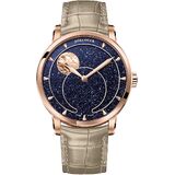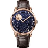 The dial is made of natural blue aventurine from Brazil. Its deep blue or violet-blue color from scaly vivianite contained within quartz crystals during geological formation. It shimmers with a beautiful, soft glow, like sky full of stars, make it most star-like natural dial material available today. In this panoramic large moon phase watch, as the dynamic moon perfectly glides across the starry surface of the blue aventurine dial, it feels as if the cosmic starry sky is right before your eyes.