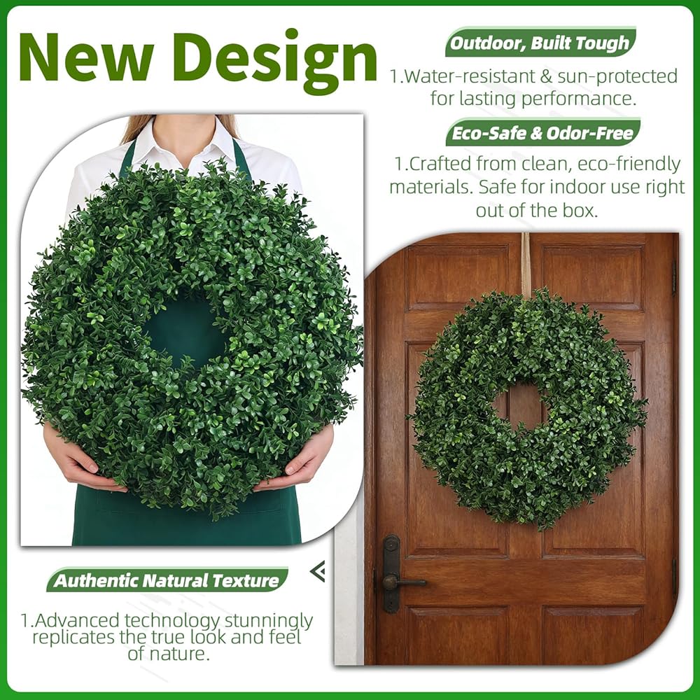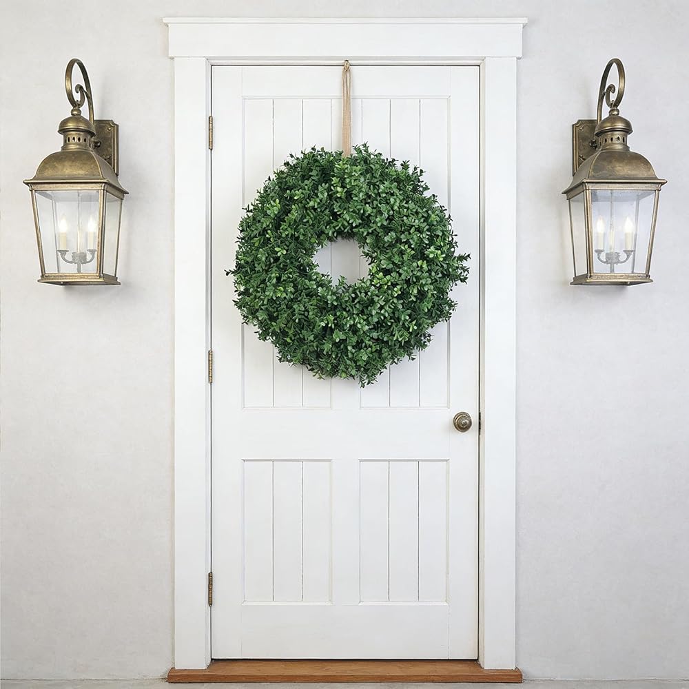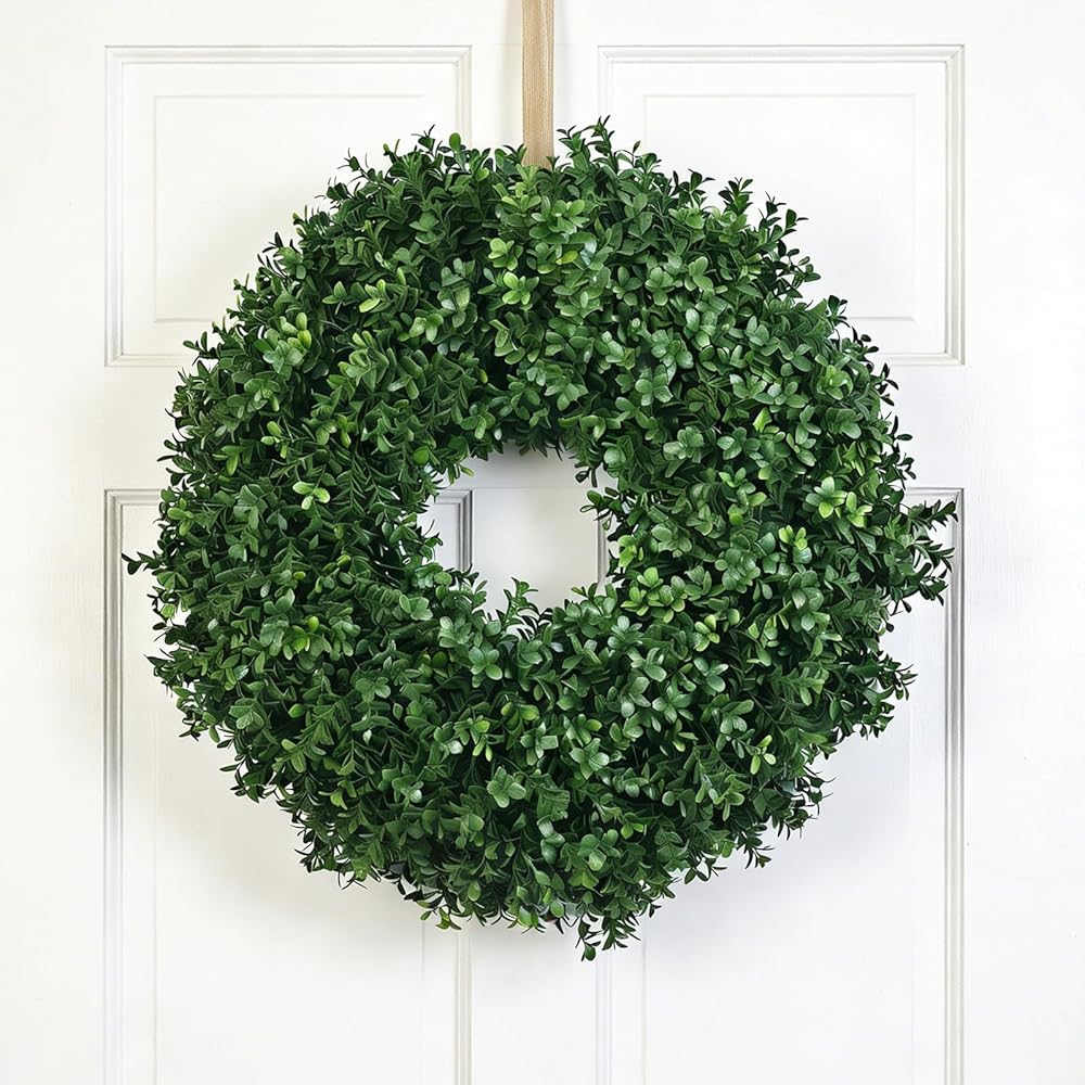 Bring lasting greenery to your home with this 24-inch Artificial Boxwood Wreath. Featuring lifelike layered leaves and UV-resistant construction, it stays fresh and vibrant indoors or outdoors all year long. Perfect for front doors, walls, and porches, it adds a welcoming, natural touch to any home style.