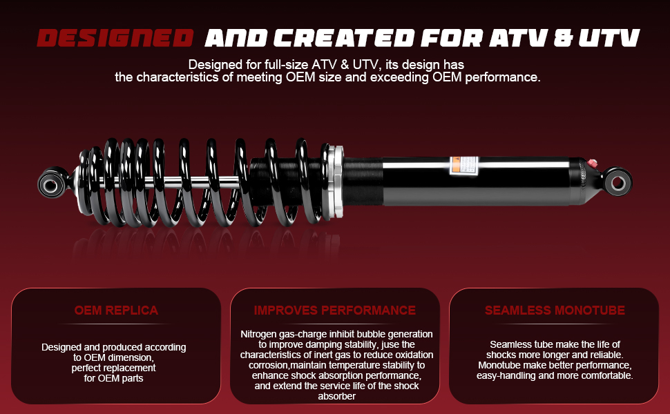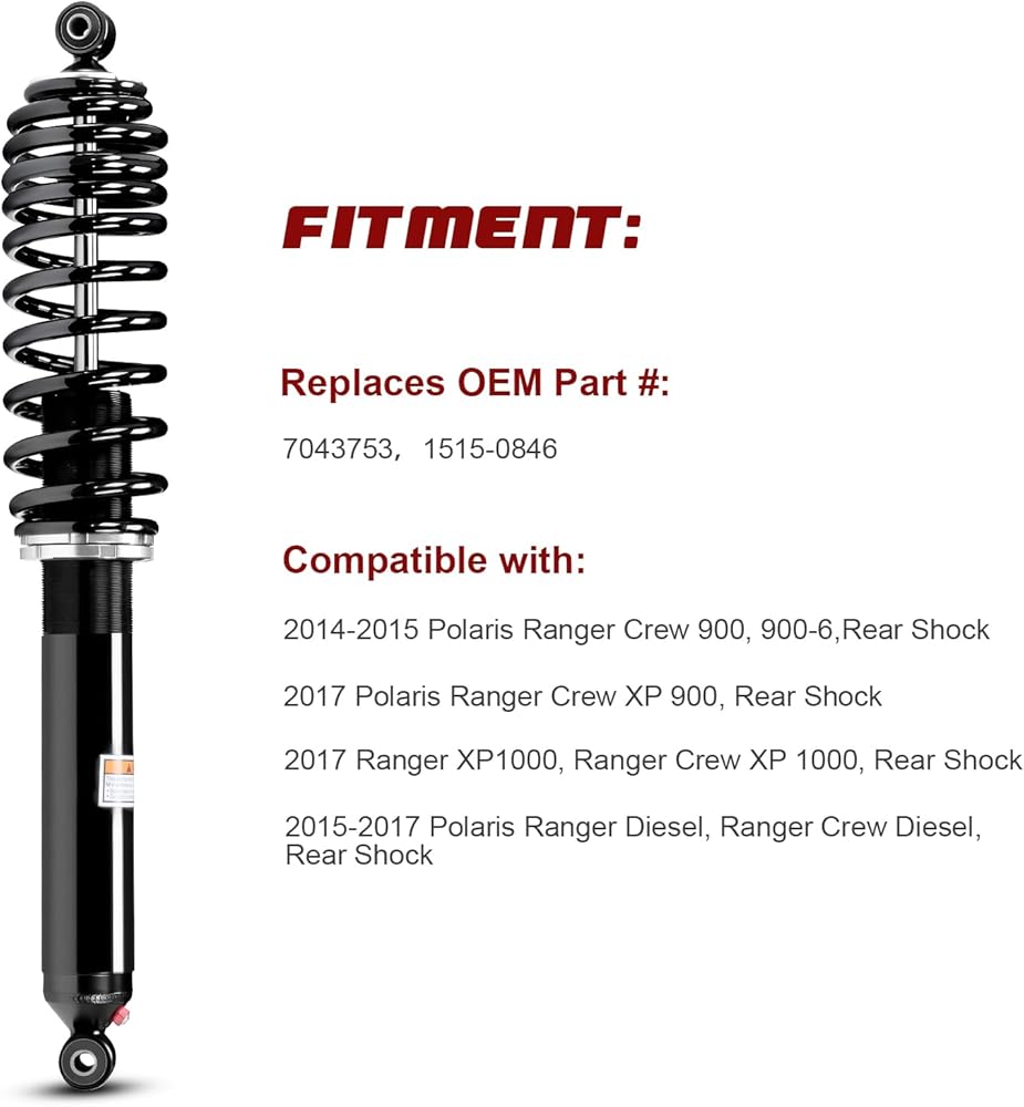 COMPATIBILITY: Designed for 2014-2015 Polaris Ranger Crew 900, 900-6; 2017 Polaris Ranger Crew XP 900; 2017 Ranger XP 1000, Ranger Crew XP 1000 and 2015-2017 Polaris Ranger Diesel, Ranger Crew Diesel ATV front shocks, providing direct OEM replacement functionality