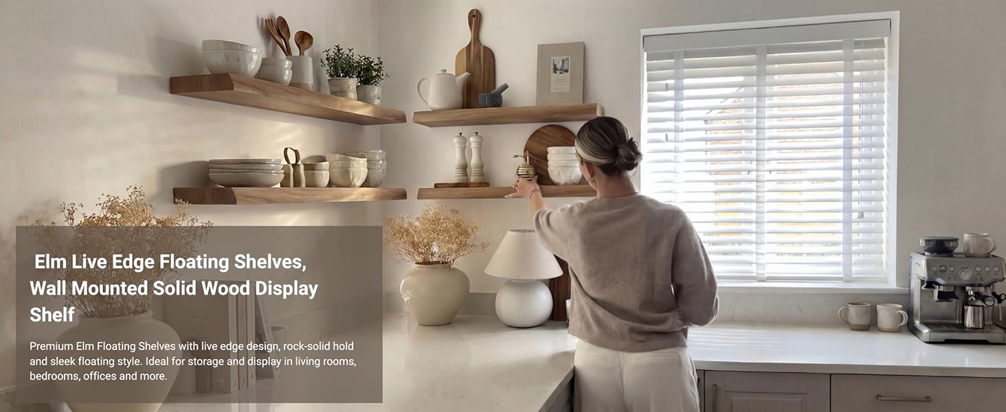 Premium handcrafted live edge floating shelves made from reclaimed solid elm wood: Each live edge floating shelf highlights distinctive natural grain patterns, knots, organic textures, and authentic character marks that celebrate the raw beauty of real wood. The naturally irregular curved edge ensures every live edge shelf is truly one of a kind, bringing refined rustic warmth and architectural interest to your wall décor.