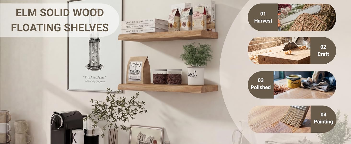 Durable solid wood construction with concealed heavy-duty support: Crafted from thick, high-quality solid elm, this solid wood floating shelf is engineered for daily use and long-term durability. Reinforced with heavy-duty hidden brackets, it installs securely and remains stable over time—no wobbling, no sagging, just dependable support.es, no worries.