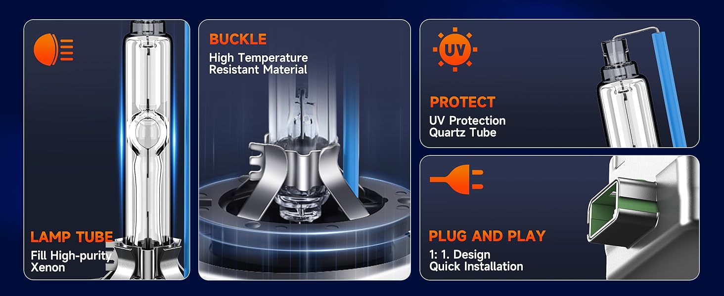 【Service Life of 3500 Hours】SENROBO xenon headlight bulbs are made of 100% quartz UV resistant glass, high-purity xenon gas, high-temperature resistant material, stainless steel metal bracket, and ceramic insulation tube. It is sturdy and durable, with a lifespan of up to 3500 hours, reducing the frequency of replacing xenon bulbs. It is IP68 waterproof and can operate stably in extreme weather conditions such as rainy, foggy, and dust storms