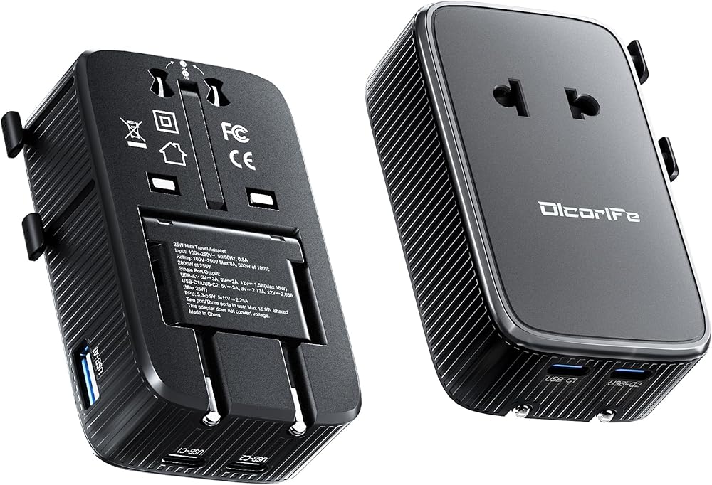 Olcorife PD25W Mini Travel Adapter, Universal Power Adapter with 2 USB-C 1 USB-A, International Plug Adapter, Travel Essentials for US to EU UK AUS (Type-C/G/A/I), 1-Pack
