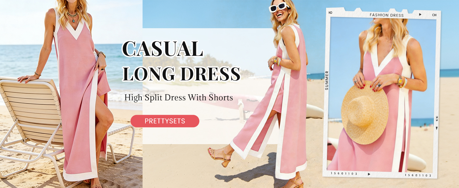 High Side Slit: The long dress with a high side slit pairs perfectly with matching shorts, offering a stylish and practical outfit that combines elegance with functionality