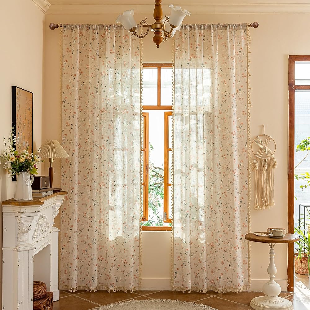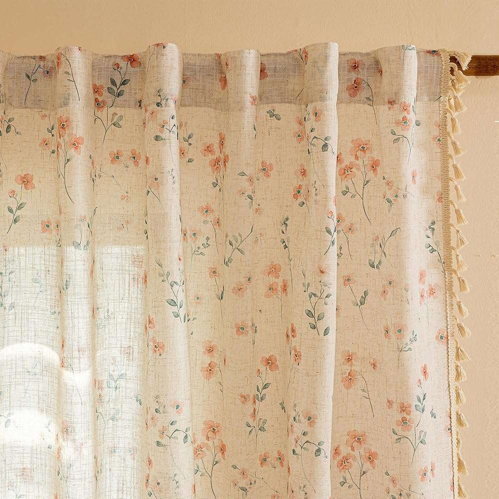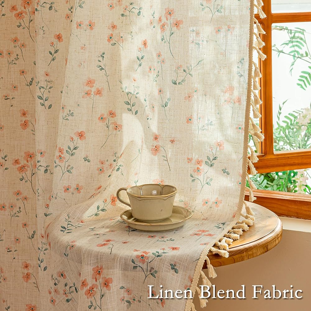 MYSKY HOME Pink Floral Boho Linen Farmhouse Spring Curtains 84 Inches Long 2 Panels Set Rustic Pattern Semi Sheer Drapes with Tassels Back Tab for Living Room Girls Bedroom Nursery, 50" Wide