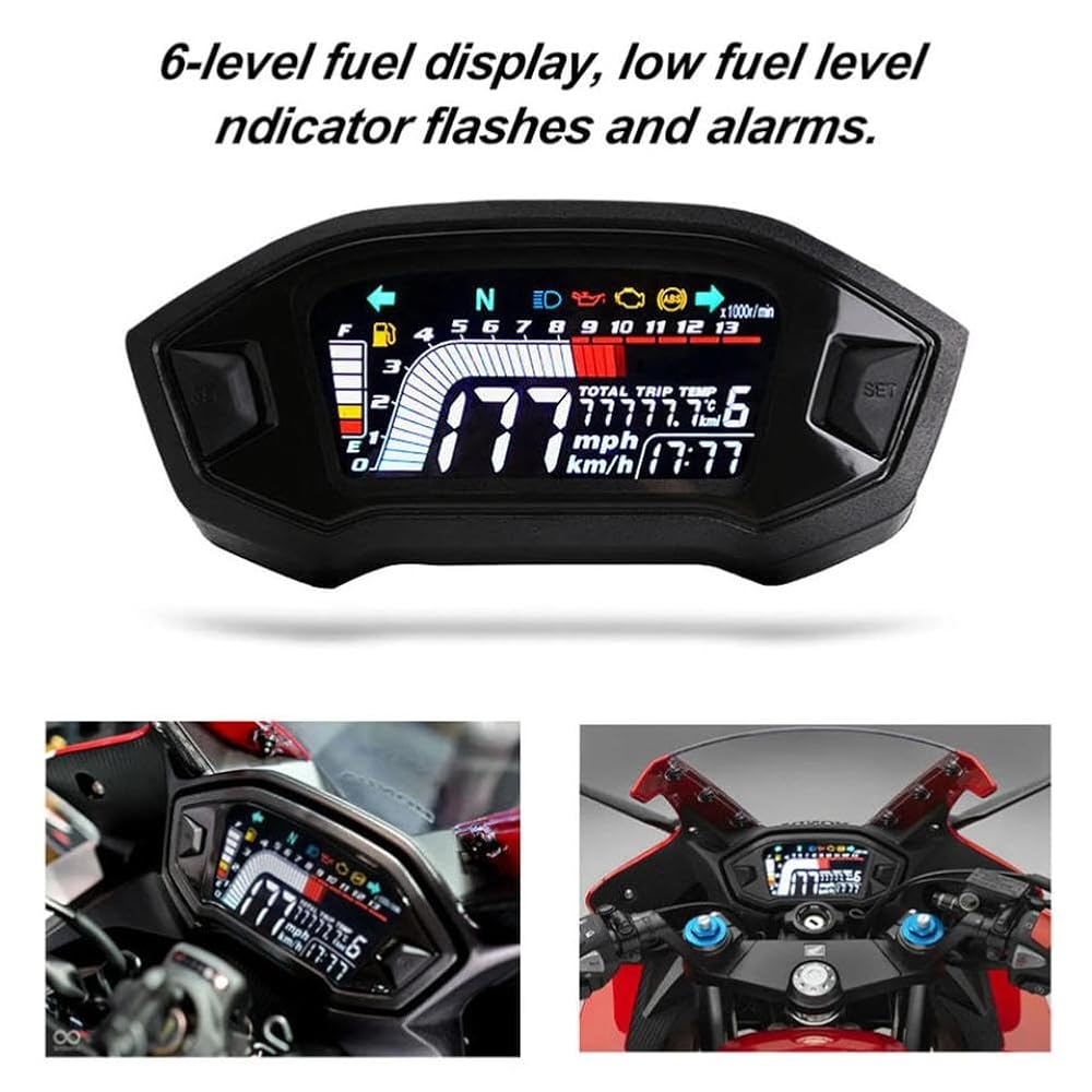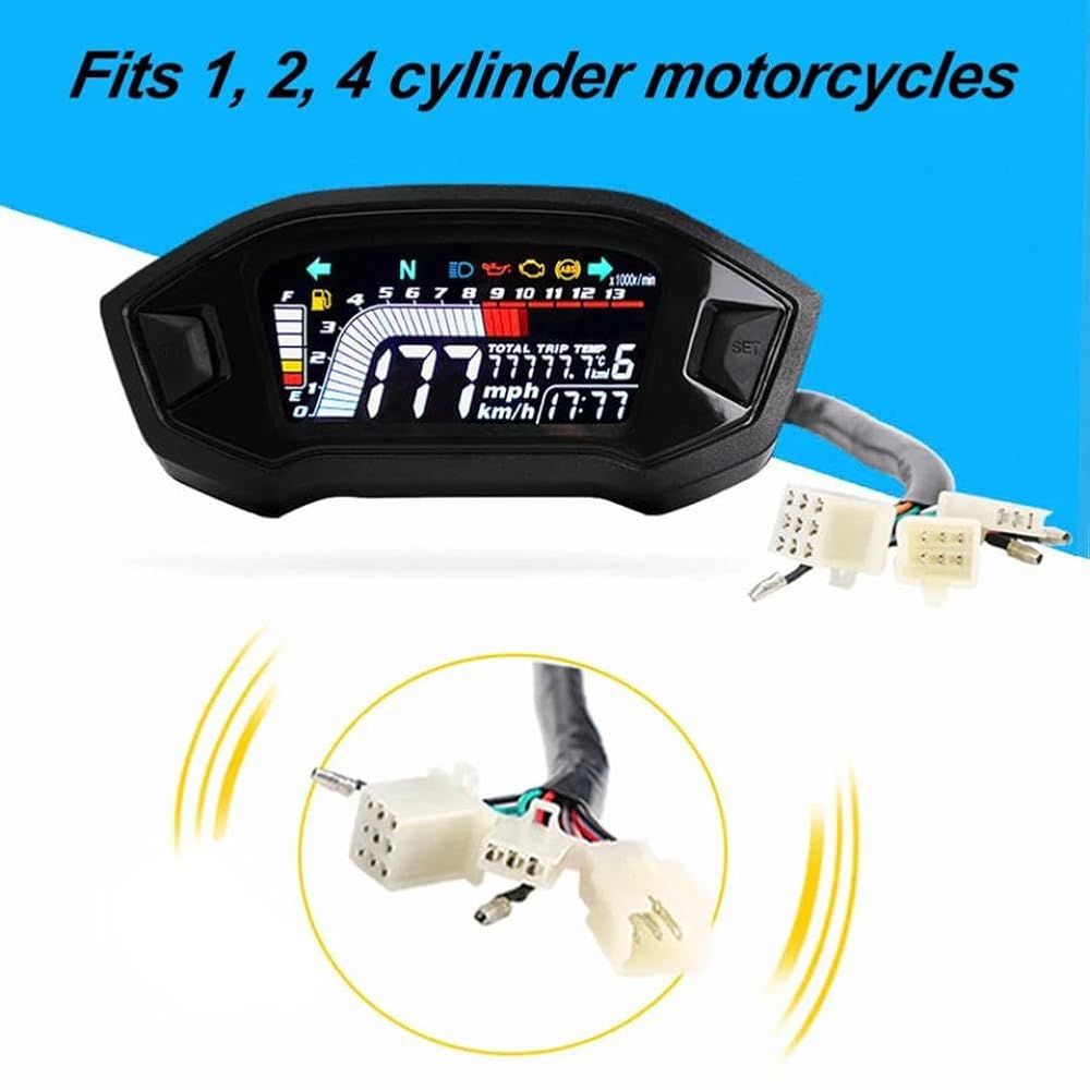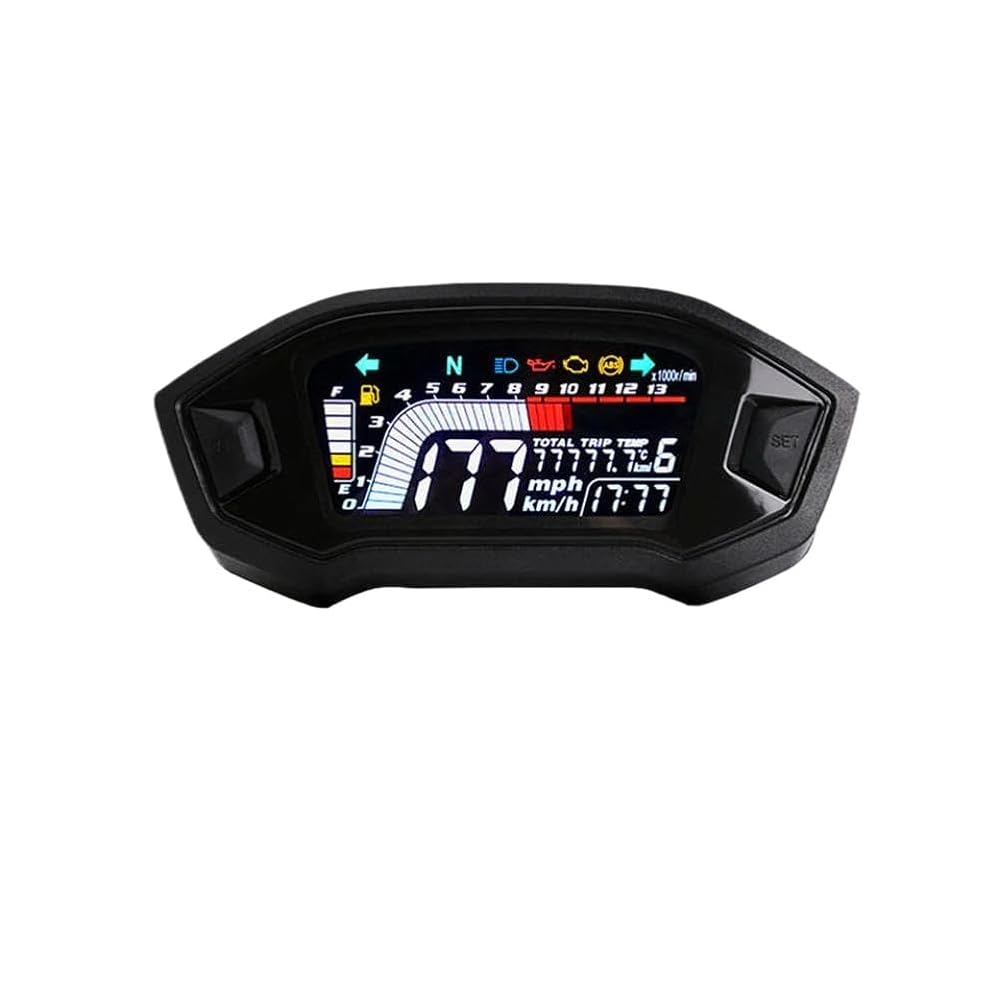 Motorcycle Digital Speedometer Universal LCD Motor Tachometer Instrument Cluster Turn Light Indicator Voltmeter Oil Gauge Digital speedometer designed for universal motorcycle use featuring an LCD display that shows speed, engine RPM, voltage, oil pressure, and turn status.The instrument cluster includes a tachometer for monitoring engine revolutions, a voltmeter to track electrical system performance, and an oil pressure gauge for engine health monitoring.Equipped with indicator lights for turn signals and other essential functions.The unit is built for straightforward installation and compatible with various motorcycle models.Display provides clear readings under different conditions. This product is an aftermarket solution.Brand names are mentioned only to clarify compatibility with specific models.